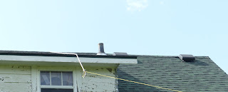 "Den it vas back onto da porch roof, vere I tied the clevis end of da rope to da string good 'n tight, den back off'n da roof and to da udder side of da 'ouse vere da line of super-strong yellow string vas 'angin'. Grippin' dat, I roun' da yar's of string back on da spool til da rope cum vit'in reach, 'an' I loosed da string, tied da rope to da truck, an' climbed onto the porch -- and' onto da dormer, an' straddlin' the peak of da roof of da 'ouse, covert da 'ole a' sealt da leak an' fixt da problem yust dat fast.